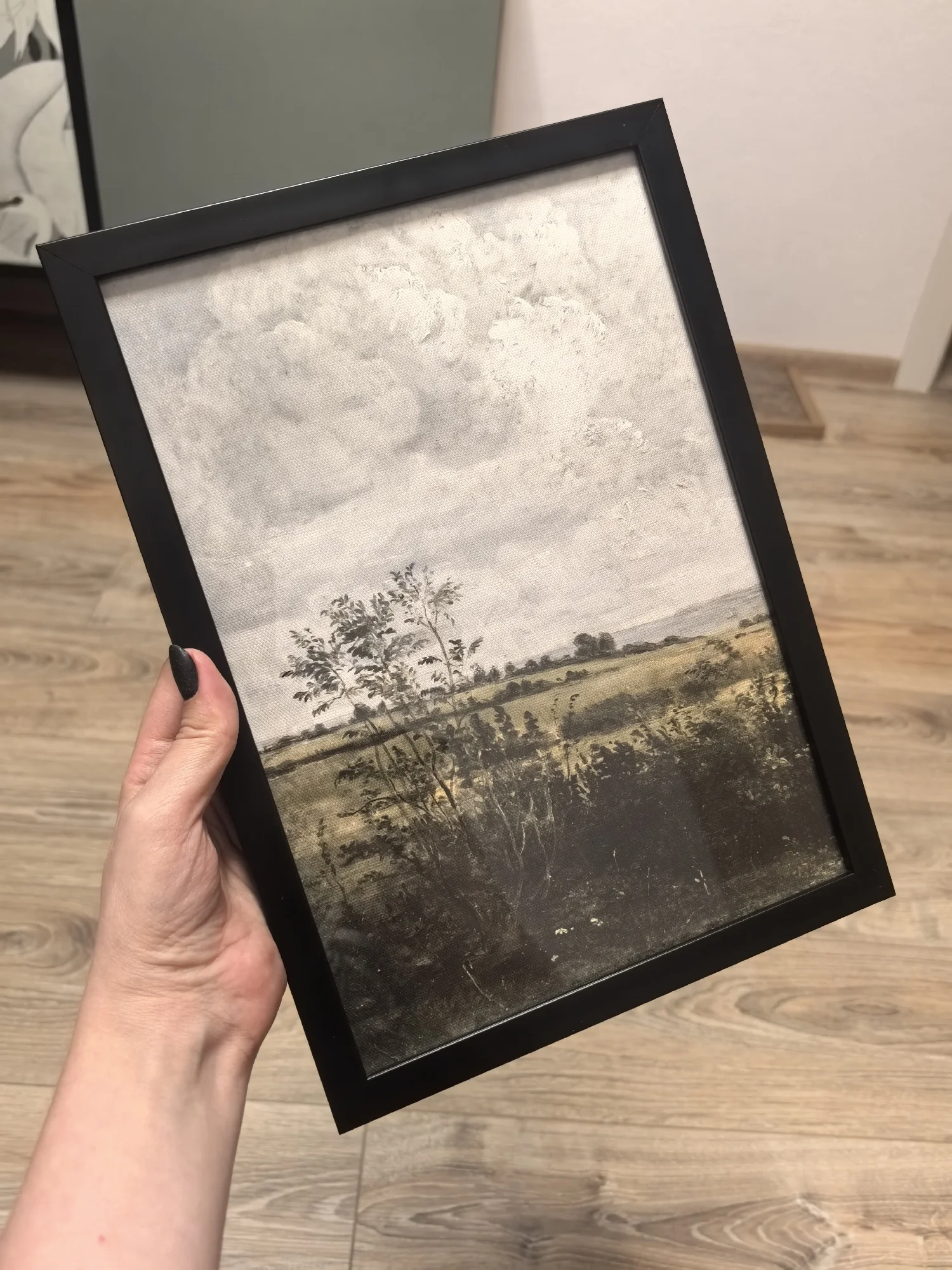 Corresponds to the declared size. Print and canvas quality at the highest level. Very cozy landscape, everywhere to the place🖤🎄